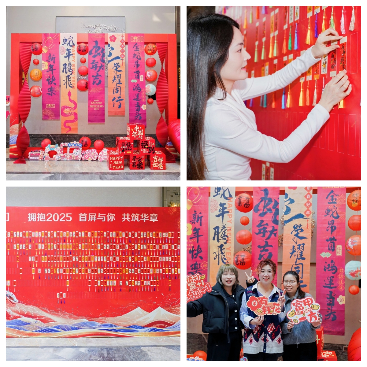 “平安喜樂”、“多財多億”、“諸事皆宜”等各色國風箋條掛滿簽到墻,大家紛紛寫上祝福語,祈愿新年都有好運勢。另一邊,精致的新年打卡區(qū)吸引了伙伴們的目光,擺起Pose來上新年第一拍。